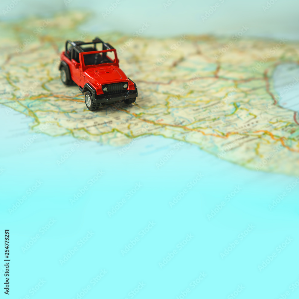 Travel on the road with map. Car travel and road trip. Concept of journey and rent a car, lifestyle. Selective focus, close-up, copy space.