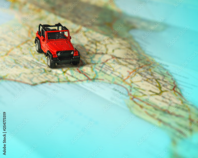Travel on the road with map. Car travel and road trip. Concept of journey and rent a car, lifestyle. Selective focus, close-up, copy space.
