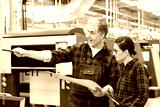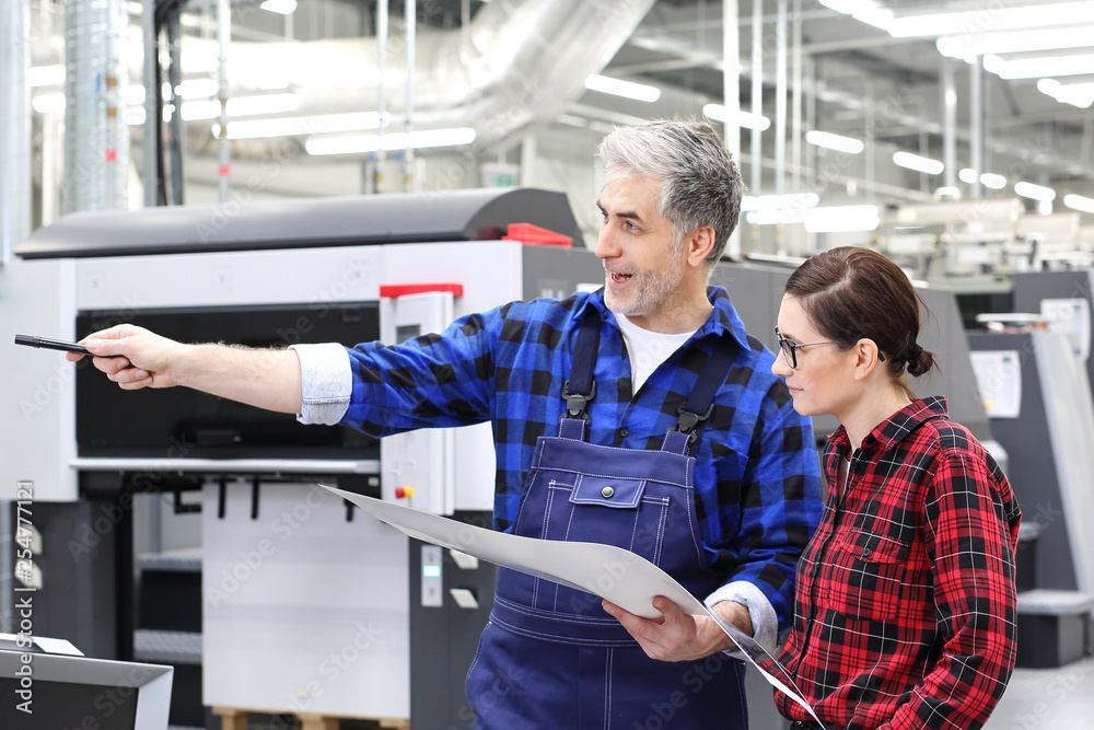 Drukarz w pracy. Rozmowa z klientem. Akcept wydruku.