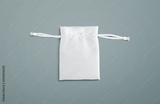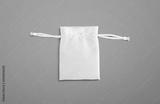 White drawstring bag on white background. Fabric cotton small bag. Isolated pouch.