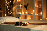 Massage stones and essential oil on table in spa salon