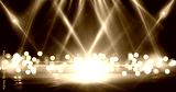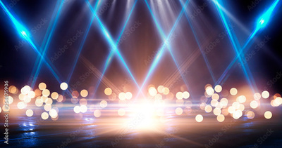 Wet asphalt, reflection of neon lights, a searchlight, smoke. Abstract light in a dark empty street with smoke, smog. Dark background scene of empty street, night view, night city.