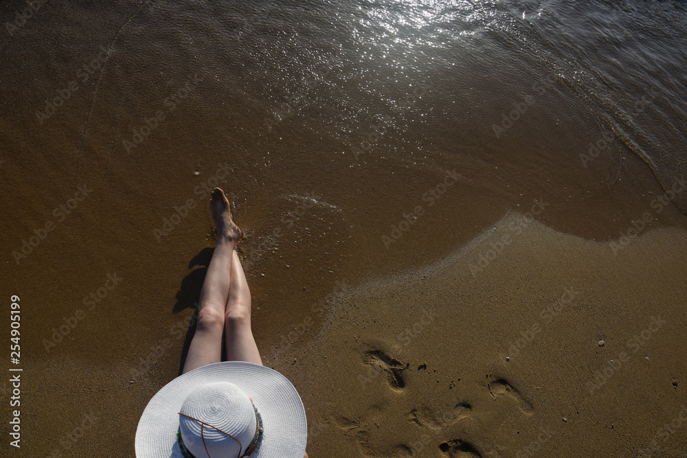 Beautiful woman with hat enjoy at the beach. Woman with long legs at sandy beach