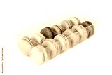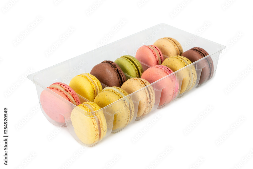 Colorful french macaroons in plastic box isolated on white