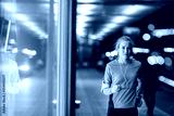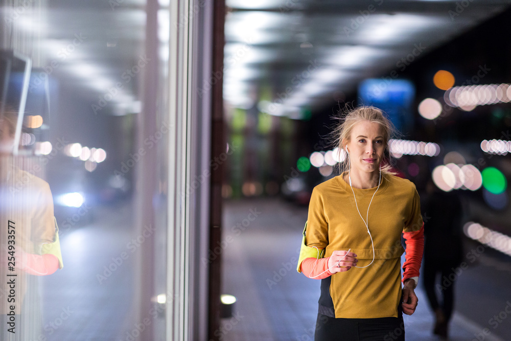 Female runner in city at night