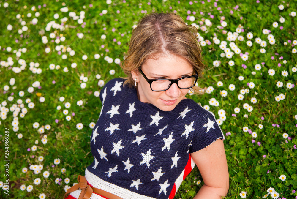 Beautiful happy young woman sitting and relaxing on the grass. Concept peaceful lifestyle