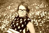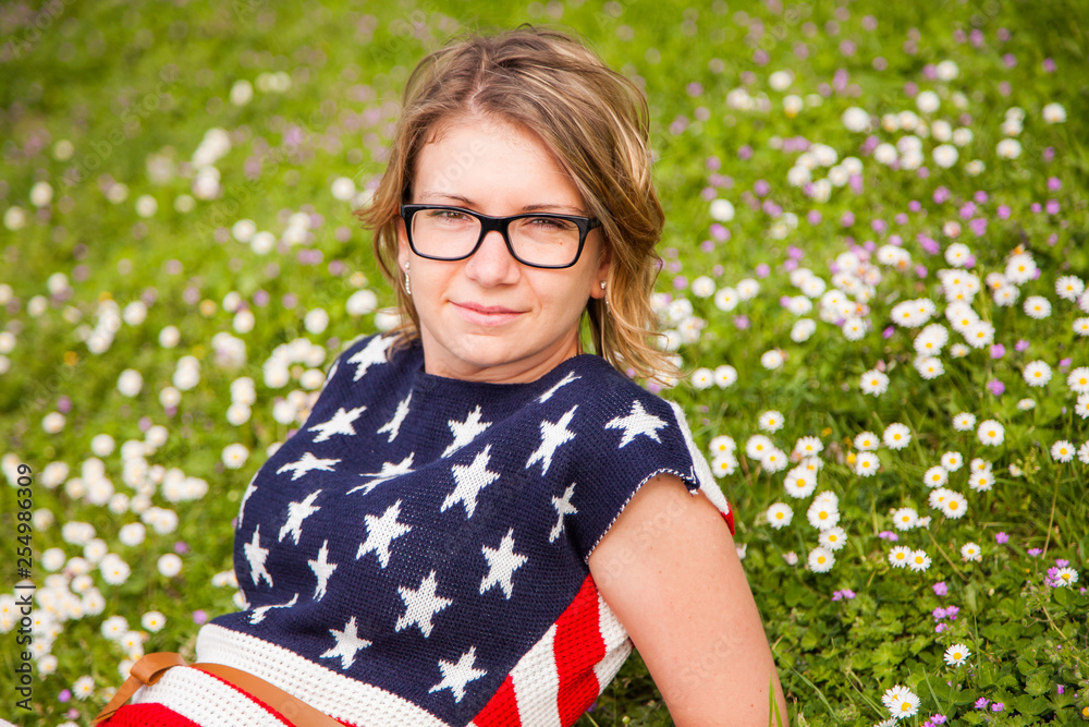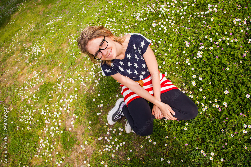 Beautiful happy young woman sitting and relaxing on the grass. Concept peaceful lifestyle