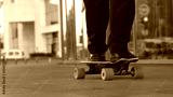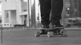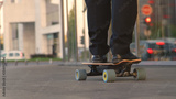 LOW ANGLE: Unrecognizable businessman longboarding through city on sunny evening