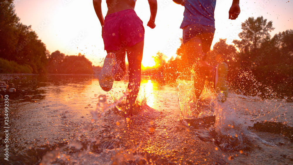 LENS FLARE: Golden sunbeams shine on fit couple jogging in the tranquil stream.