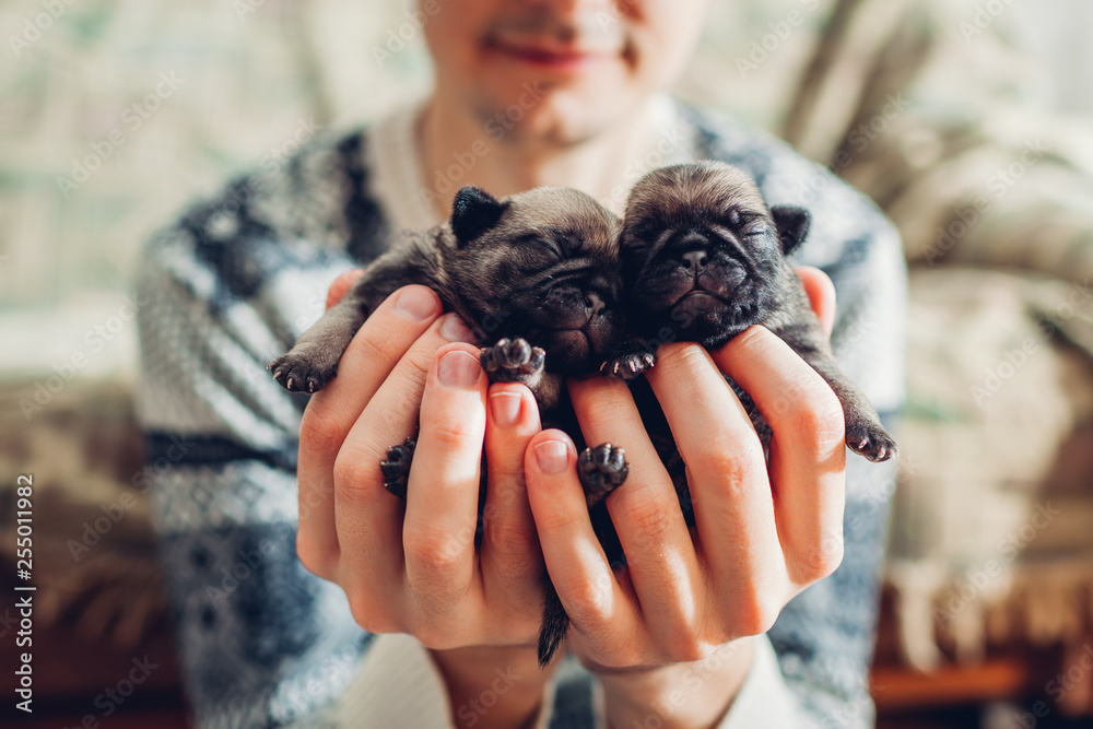 Young man holding pug dog puppies in hands. Little puppies sleeping. Breeding dogs