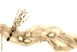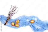 Golden colored Easter eggs with willow catkins branches on light blue gauze fabric isolated on white background. Top view. Place for text.