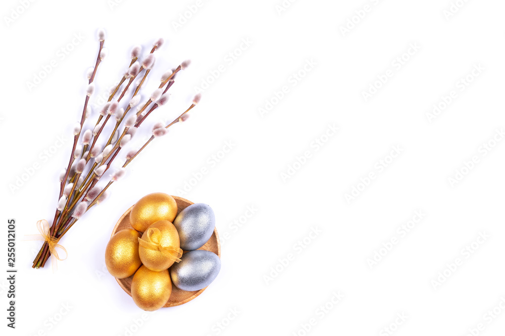 Golden and silver colored Easter eggs on wooden plate with willow catkins branches isolated on white background. Place for text.