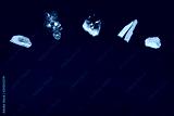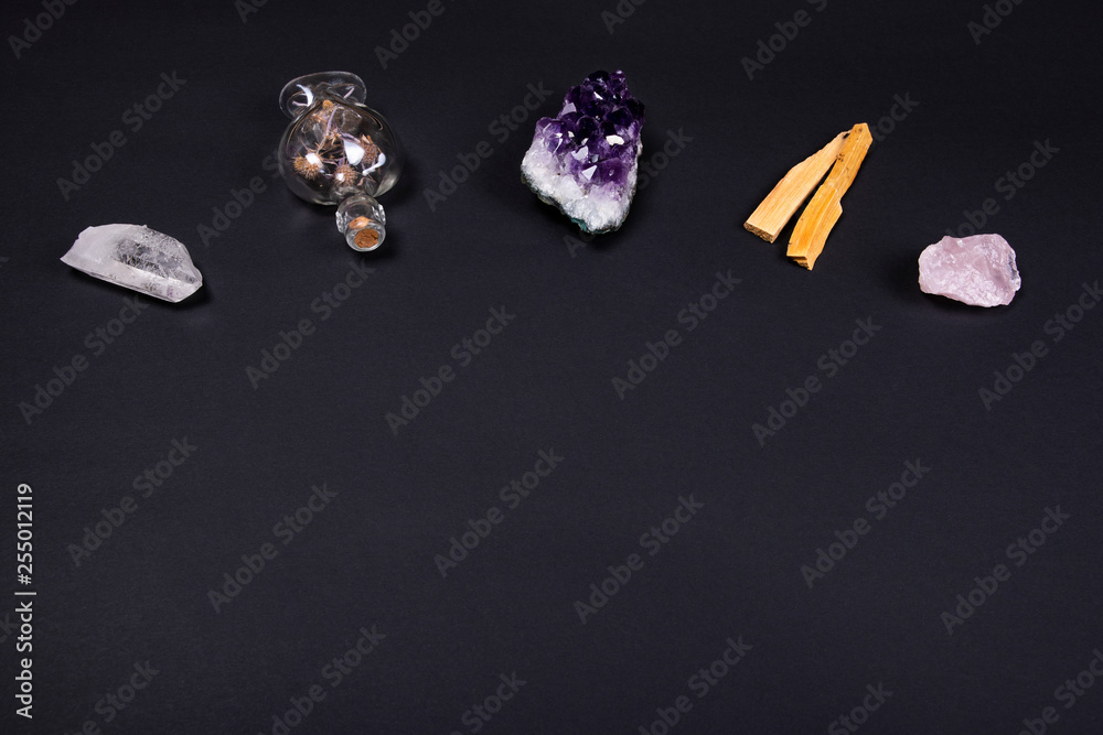 Amethyst and quartz crystal stones, palo santo wood and decorative bottle on black background.
