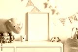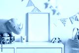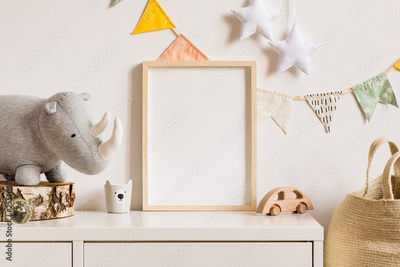The modern scandinavian newborn baby room with mock up photo frame, wooden car, plush rhino and clouds. Hanging cotton flags and white stars. Minimalistic and cozy interior with white walls.Real photo