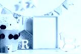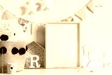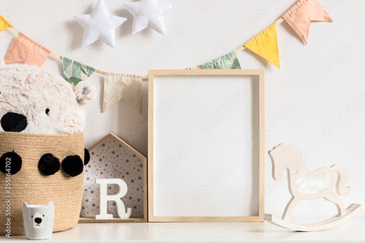 Stylish and modern scandinavian childroom interior with mock up photo or poster frame on the white shelf. Toys, teddy bear in basket, rocking horse and hanging cotton colorful flags and stars. Blank.