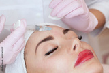 The cosmetologist makes the facial injections procedure for tightening and smoothing wrinkles on the face skin of a beautiful woman in a beauty salon.Cosmetology skin care.