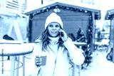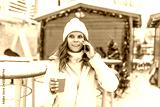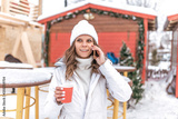 Beautiful girl in the winter in city on a holiday, calls on the phone. Happy smiling in her hands a cup of coffee with tea. Against the backdrop of snow-covered cafe.