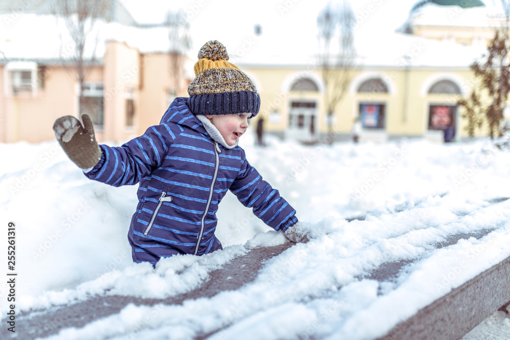 A little boy of 3-6 years old plays in the winter in the city, happy having fun playing snowballs, collecting snow from the bench, emotions of joy and fun at the weekend in nature in winter.