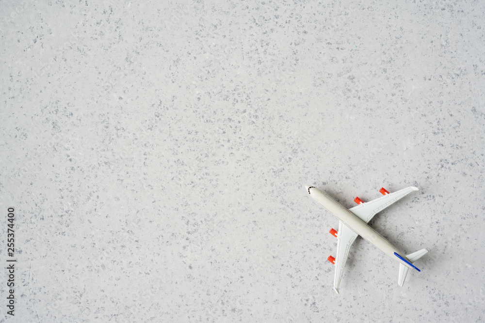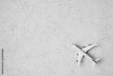 Time to travel concept. plastic plane jet toy passenger with alarm clock