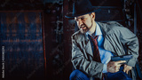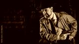 Detective with the gun wearing a fedora hat and a trench coat, dark background.