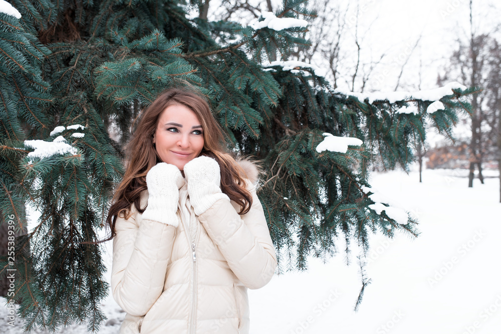 A brunette girl standing park winter against background snowy Christmas trees. A happy smiling woman dreams, free space for text. Warmed in warm white mittens and jacket, snow drifts in background.