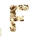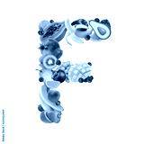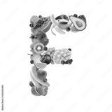 Letter F made of different fruits and berries, fruit alphabet isolated on white background