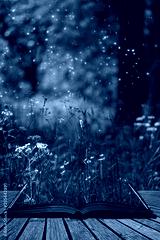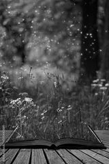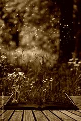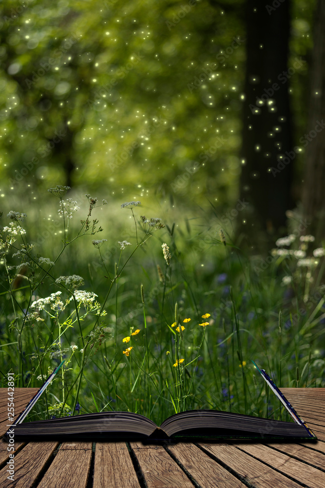Stunning fantasy style landscape image of fireflies in night time forest scene coming out of pages of open story book