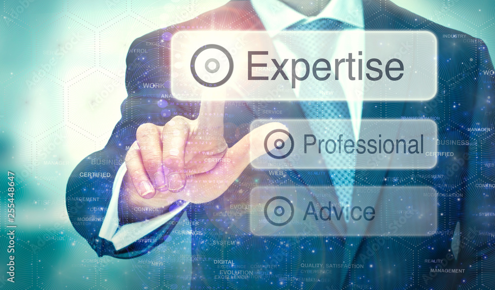 A business man selection a button on a futuristic display with a Expertise concept written on it.