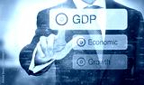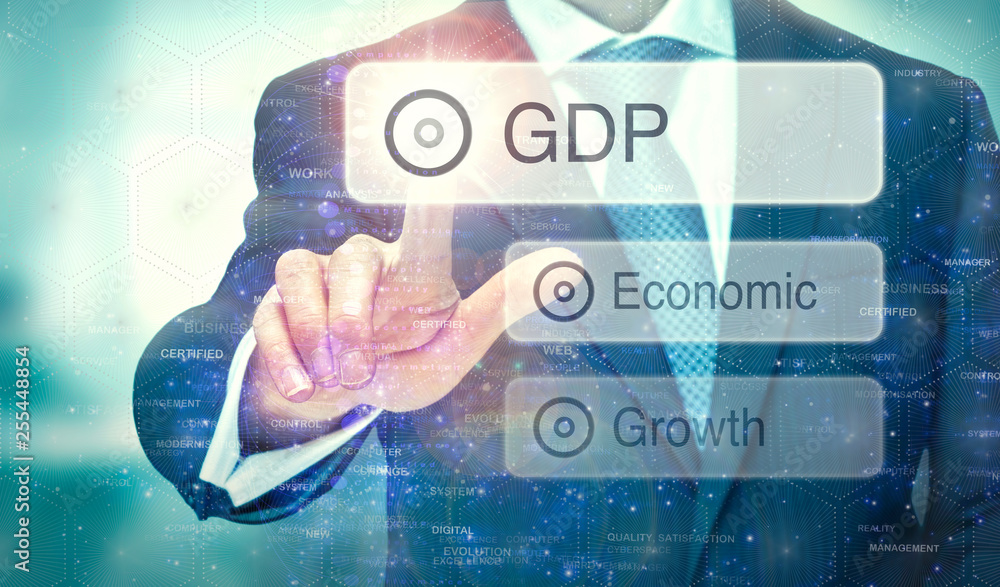 A business man selection a button on a futuristic display with a GDP concept written on it.