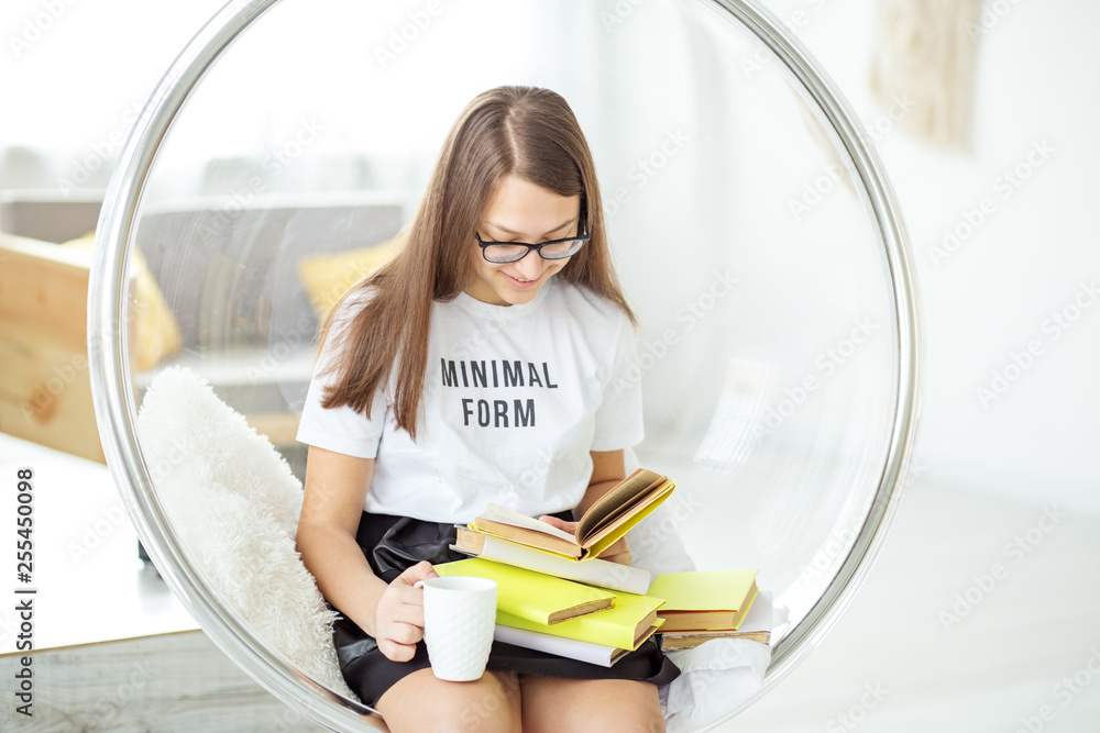 Teen reads an interesting book with glasses. Drinking tea. Concept of education, hobby and study and world book day