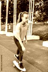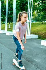 A girl is a schoolgirl of 12-15 years old, riding a skateboard in the summer in the city, an asphalt road. Casual clothes, jeans sneakers T-shirt.