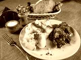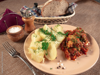 Boiled potatoes with stewed fish and vegetables
