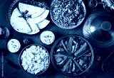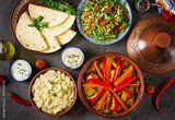 Moroccan food. Traditional tajine dishes, couscous and fresh salad on rustic wooden table. Tagine chicken meat and vegetables. Arabian cuisine. Top view. Flat lay