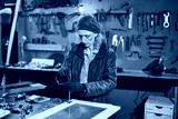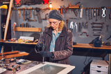 Woman carpenter sanding old window in a retro workshop.
