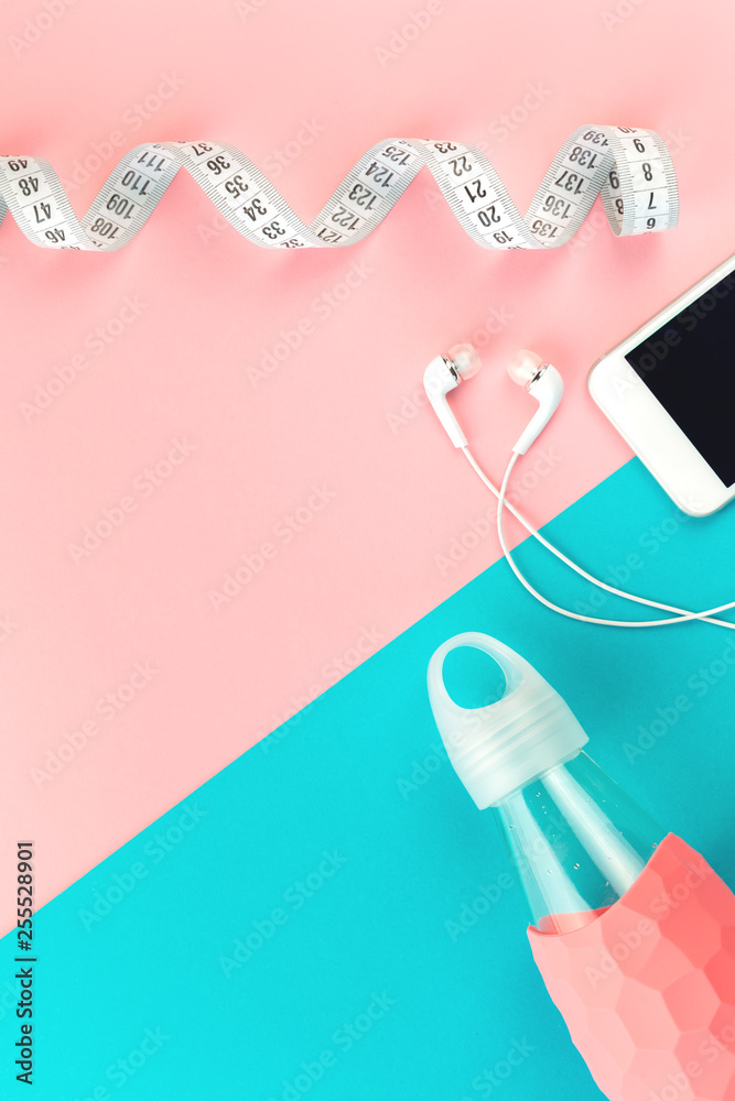 Mobile cell phone and earphones with measure tape, trendy coral glass water bottle on pink blue background in flat lay with copy space. Weight management and healthy lifestyle concept