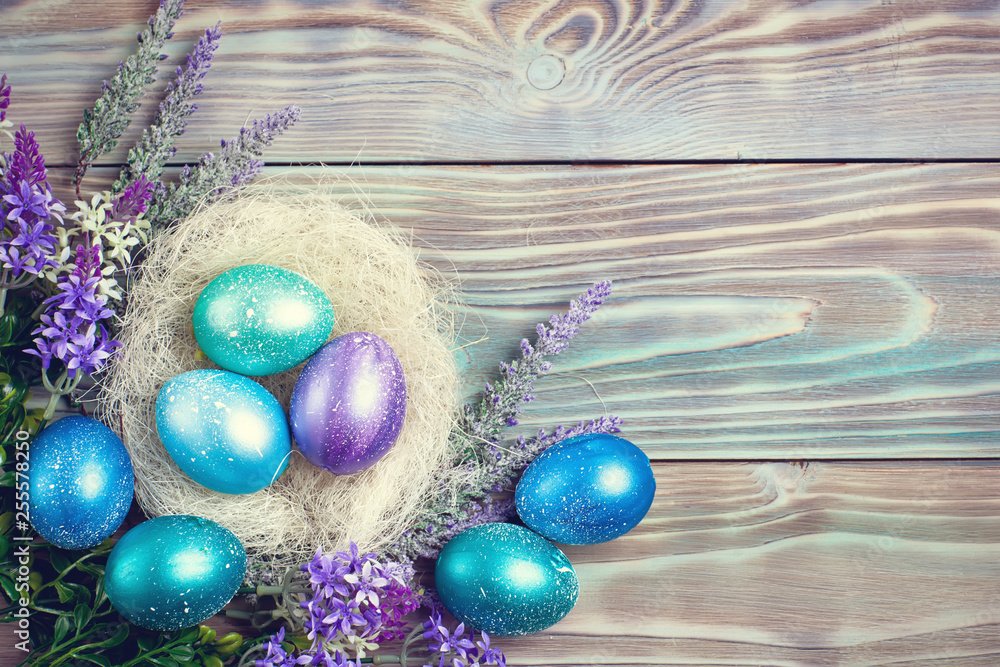 Happy Easter. Congratulatory easter background. Background with copy space. Selective focus. Top view. Horizontal.
