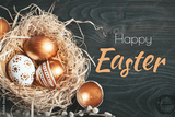 Happy Easter. Congratulatory easter background. Easter eggs and flowers. Selective focus.