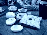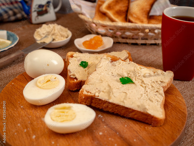 Toast with herring oil, boiled eggs and tea