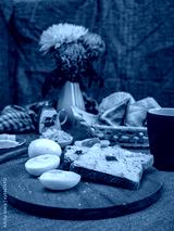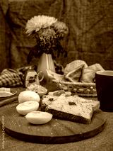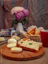 Toast with herring oil, boiled eggs and tea