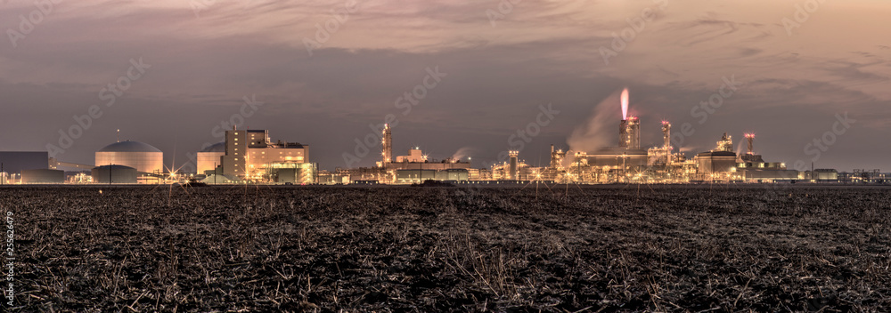 Sprawling fertilizer manufacturing facility that lights up the sky at night. Railway tanker cars have direct access to main arterial routes.