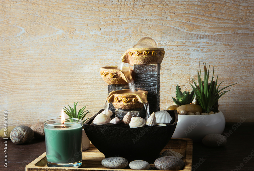 Portable indoor fountain for good Feng Shui in home or office. Small indoor tabletop fountain with water flowing. Spiritual mind and soul balance concept. Green plants in flower pot on background.