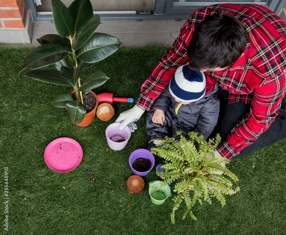 fern, pot, and shovels with man preparing for gardening on green lawn