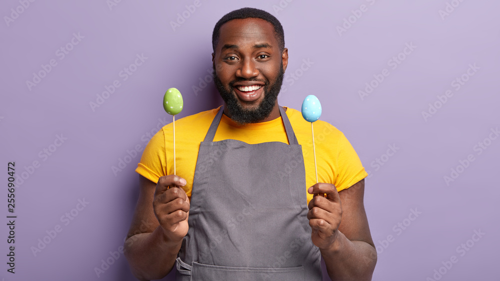Positive plump dark skinned man holds two colored eggs on sticks, being in good mood after painting and Easter preparation, wears yellow t shirt and grey apron, isolated over purple background