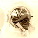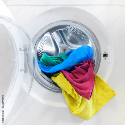 Washing machine loaded with colorful clothes