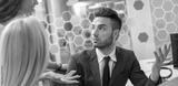 Portrait of attractive handsome young business man talking with female colleagues in modern office