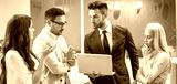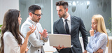 Panoramic view of business people discussing project on laptop during a meeting in modern office