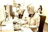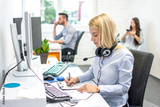 Beautiful blond business woman doing some paperwork while sitting near the computer at office
