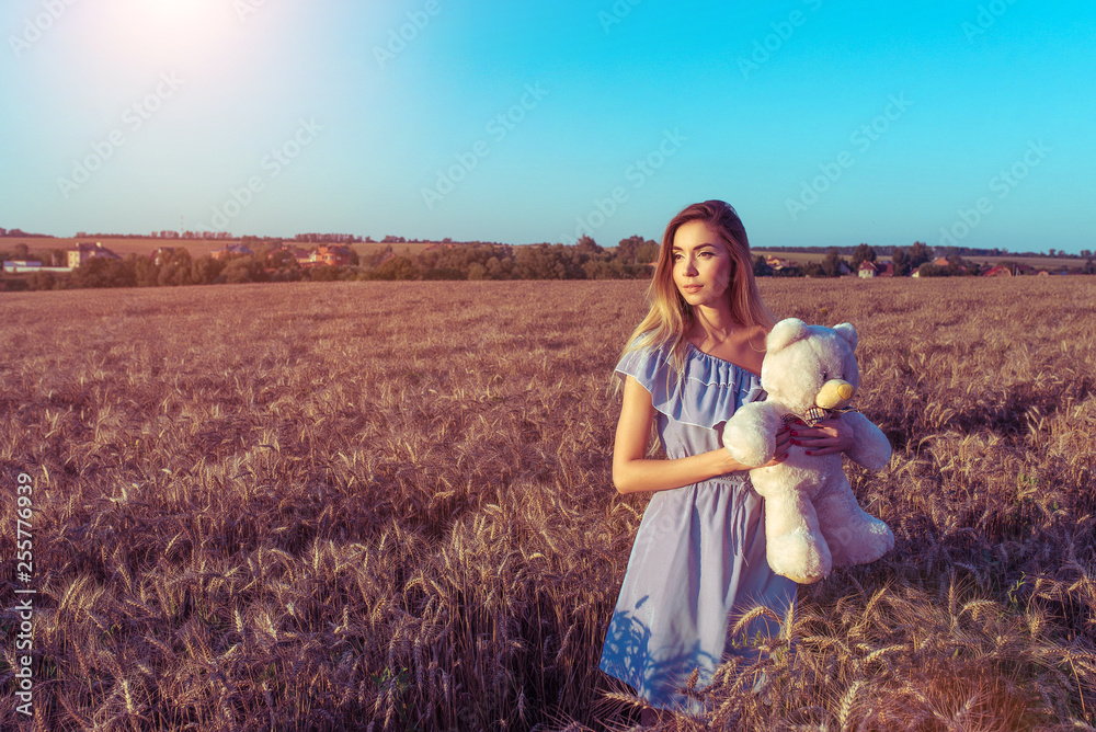 Beautiful summer woman wheat field, blue dress, hands of children's toy teddy bear. Free space for text. Rest rural field. A gift in nature, after party. Concept thought and fantasy children's dreams.