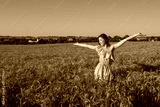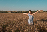 A beautiful and young girl is standing in a summer wheat field. Arms outstretched happy smiles rejoices sunrise and sunset. Free space for text. Emotions of happiness tenderness in a blue dress.