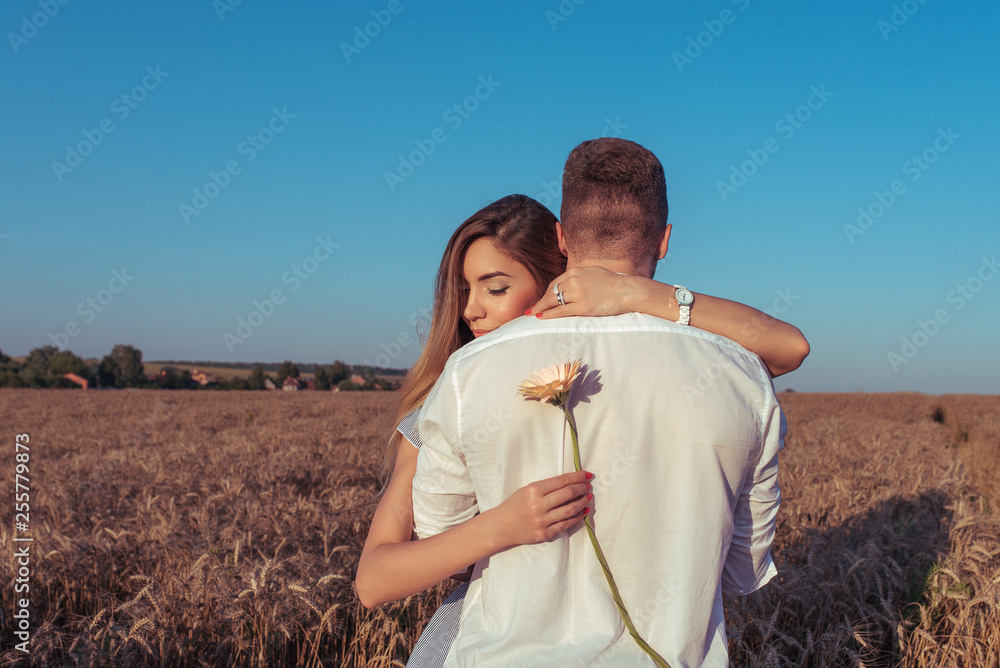 Beautiful and young couple man and woman, in summer wheat field, behind gift is flower, surprise and tenderness, happy hugging. Romantic relationships, love mutual understanding. Free space for text.